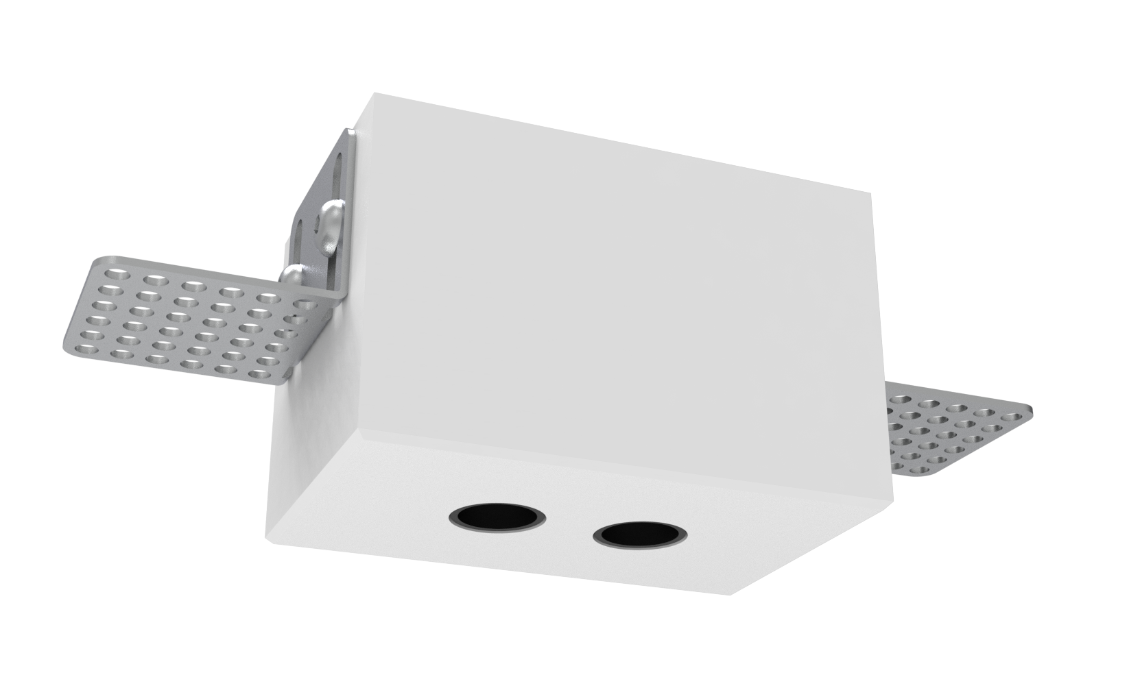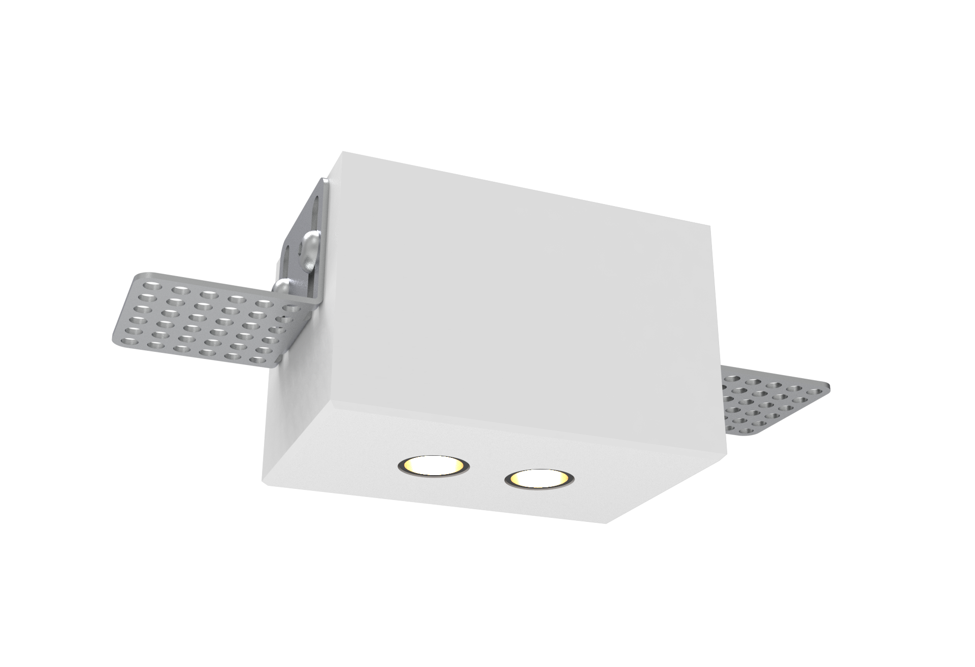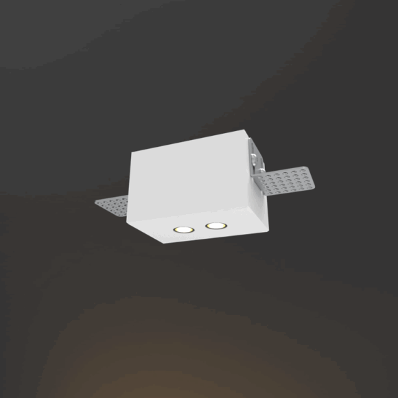 Ensemble de deux ou cinq spots à orientation fixe, encastrés dans un bloc de staff avec équerres pour fixation sur BA13 Spots équipés de canons basse luminance, fixés par des poussoirs à ressorts